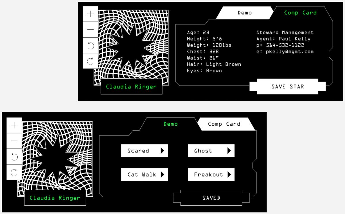 Vectors for augmented 3D user interface. [Left side] depicts the actor’s unique image target above their name, and interactive buttons to control the actor’s 3D model. [Right side] toggles between the Comp Card with user stats and contact information, and Demo card with a selection of pre-recorded animations. Button to “Save Star” to the application is enabled in both views.